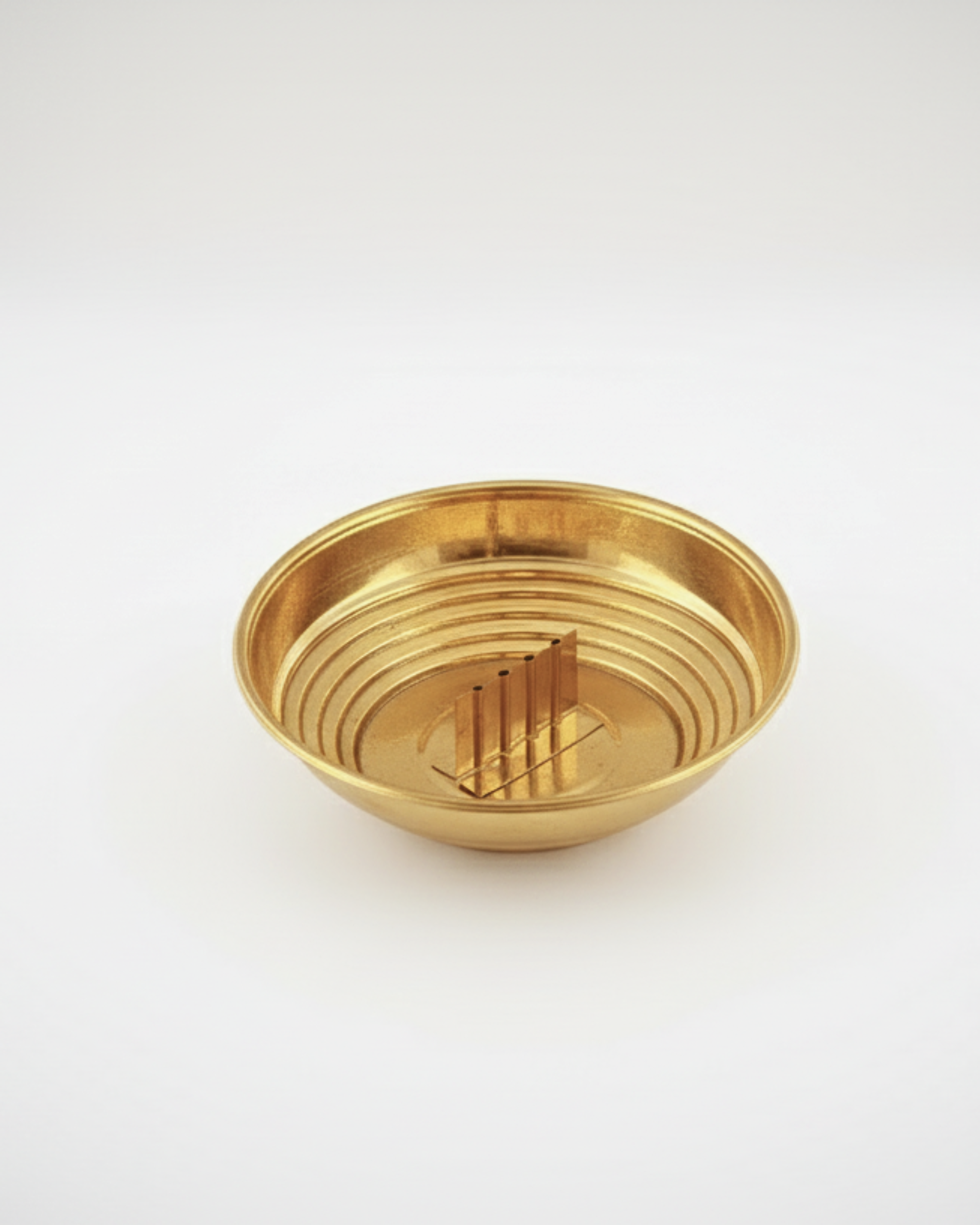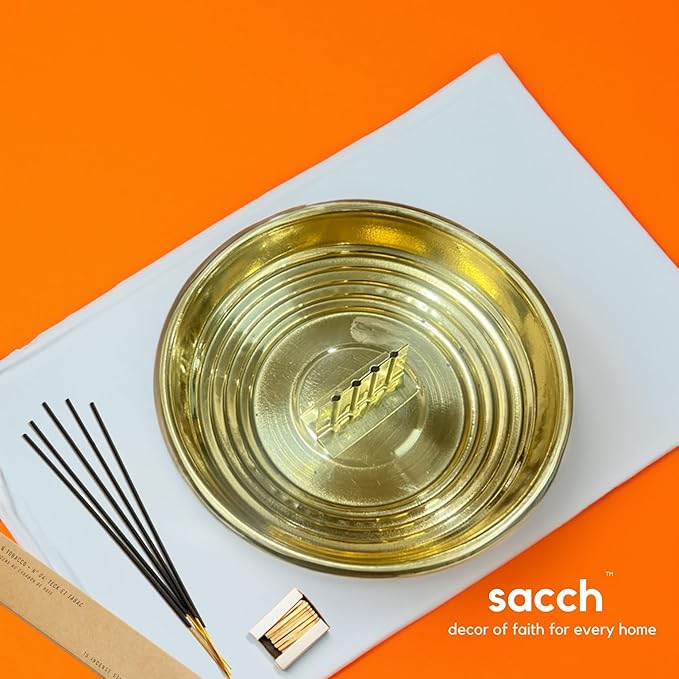 This pure brass agarbatti holder is a compact incense stand with a built-in ash catcher tray that keeps your surface clean while you burn multiple sticks at once.
